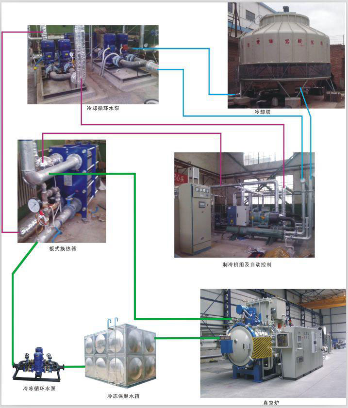 循环水冷却系统主要由宏星水冷螺杆冷水机组、冷却塔、循环水池、循环水泵、旁滤系统、控制仪表系统及管道、阀门等组成。